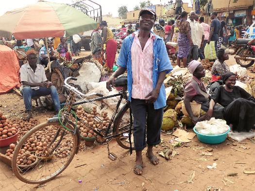 Joseph works as a bicycle delivery man at Kasubi Market, transporting purchases to customers' homes. |