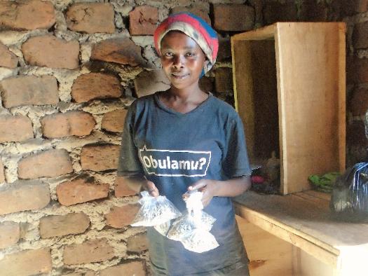 Fausta walks through the neighborhood selling small silver fish, known locally as mukene. Mukene are cheap and nutritious, providing vitamins, minerals, and Omega fatty acids. |