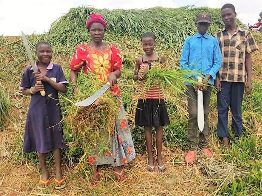 Teopista and her children cutting swamp grass with pangas (machetes). |