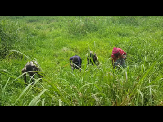 Teopista and her children cutting swamp grass with pangas (machetes). |